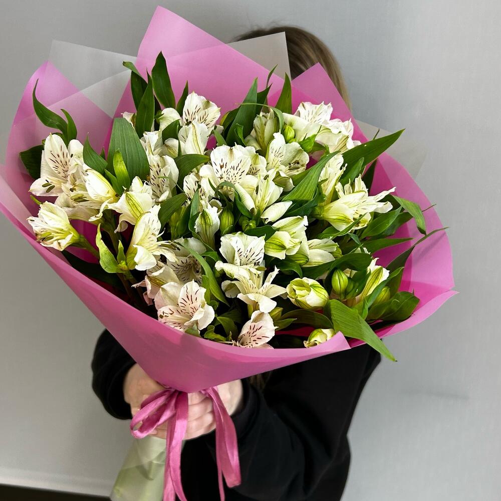 Лента атласная – 2 шт.Альстромерия – 11 шт.Упаковка дизайнерская – 2 шт.Зелень – 2 шт.