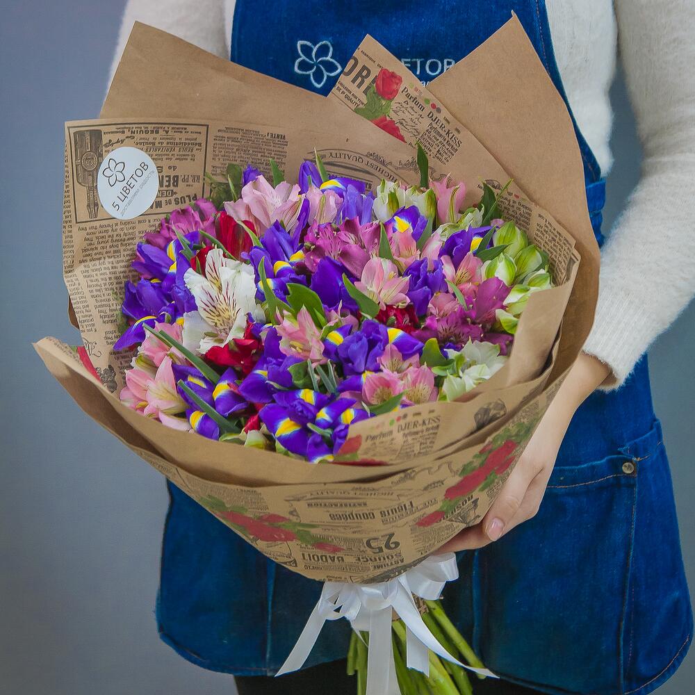 Букет из 20 ирисов и 15 альстромерий