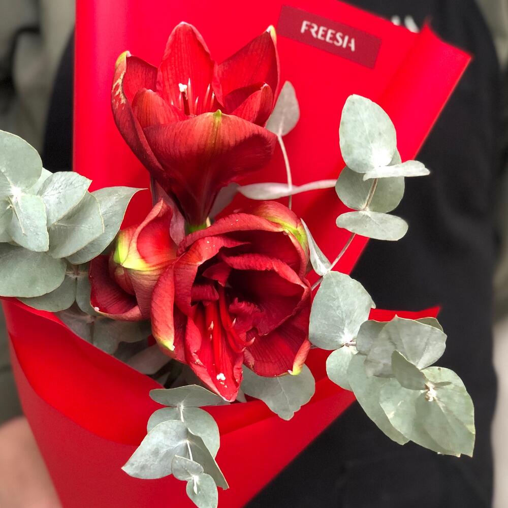Амариллис – 1 шт.Эвкалипт – 5 шт.Упаковка дизайнерская – 1 шт.Лента атласная – 1 шт.транспортировочная упаковка – 1 шт.