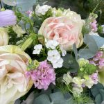Садовый букет с пионовидными розами, клематисом и эустомой