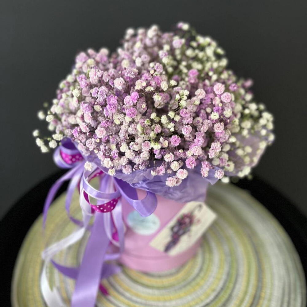 “Сиреневый туман” – композиция из гипсофилы в шляпной коробке