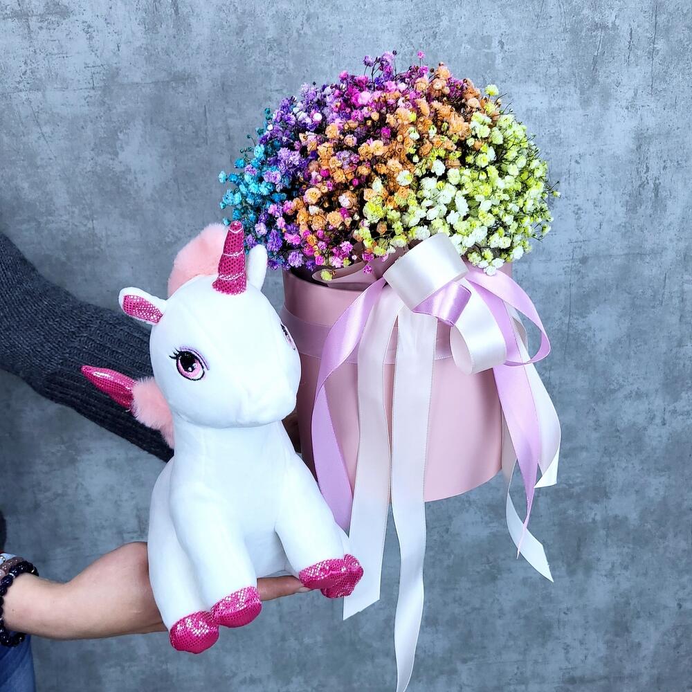 Единорог Лизонька со стаканчиком белоснежной гипсофилы