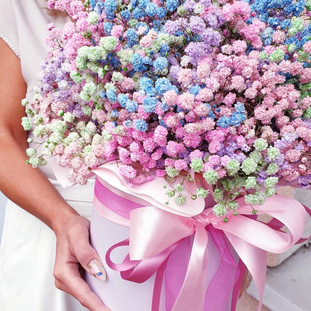 Лента атласная – 3 шт.Коробка шляпная большая – 1 шт.Открыточка с вашими пожеланиями – 1 шт.Оазис флористический – 1 шт.гипсофила радужная – 11 шт.любовь флориста (бесплатно) – 1 шт.