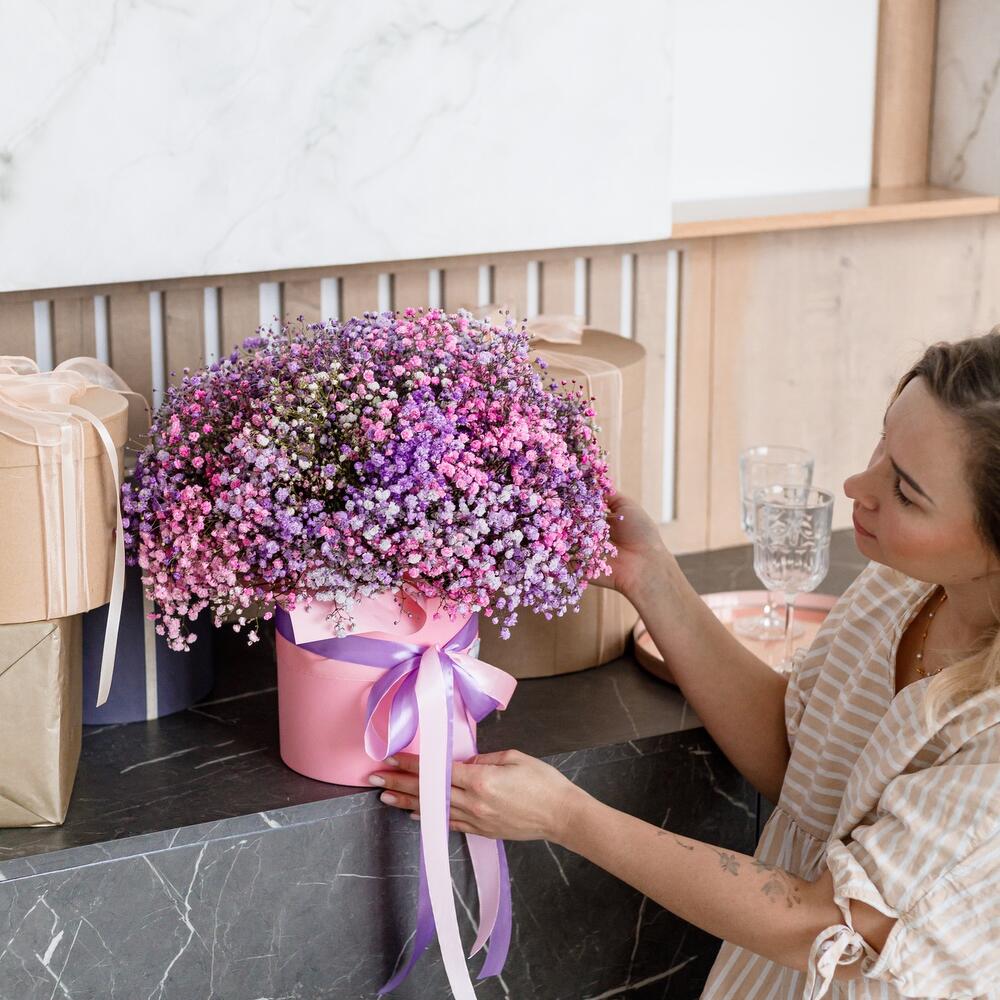 Гипсофила – 15 шт.Оазис флористический – 3 шт.Коробка шляпная – 1 шт.Лента атласная – 2 шт.Корейская пленка – 1 шт.