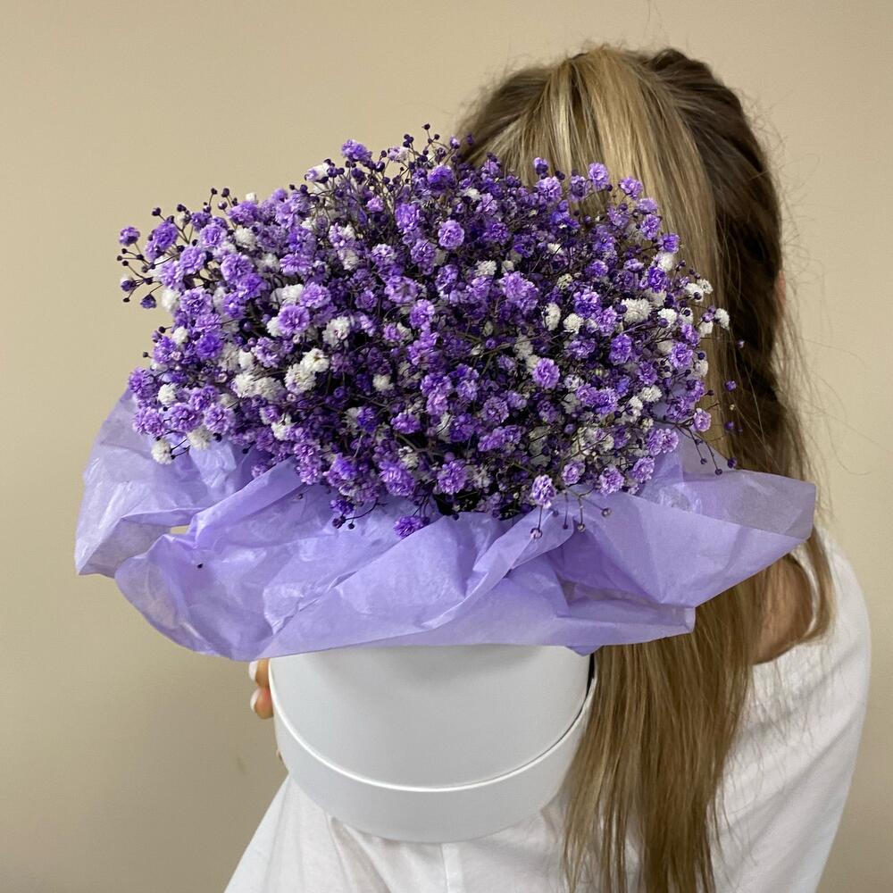 “Сиреневый туман” – композиция из гипсофилы в шляпной коробке