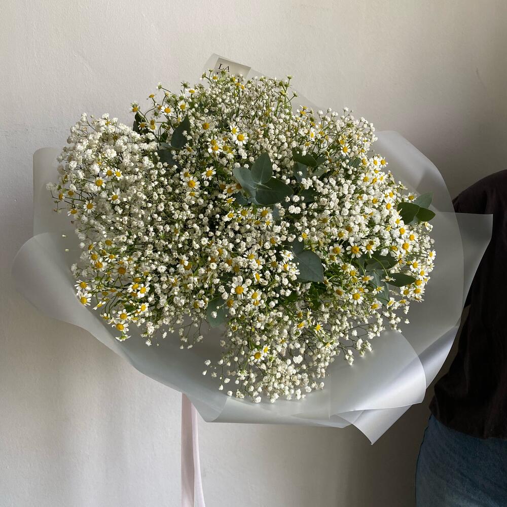 гипсофила белая – 11 шт.Матрикария (Ромашка Камила) – 10 шт.Эвкалипт пучок – 1 шт.Упаковка дизайнерская – 1 шт.Лента атласная – 1 шт.инструкция по уходу за цветами – 1 шт.Кризал (подкормка) – 1 шт.Транспортировочная коробка – 1 шт.Аквапак – 1 шт.