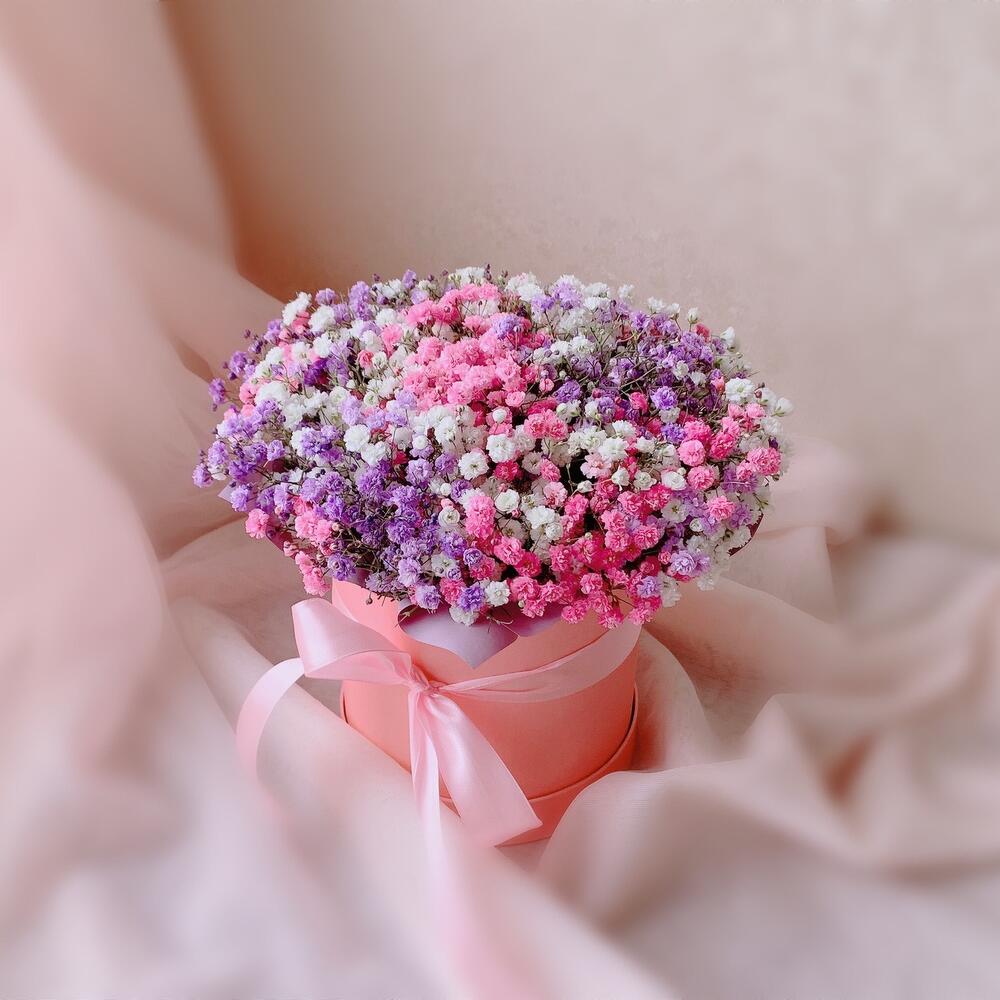 Радужная гипсофила в шляпной коробке