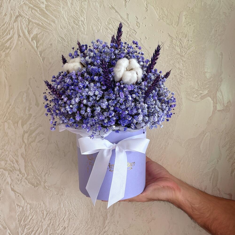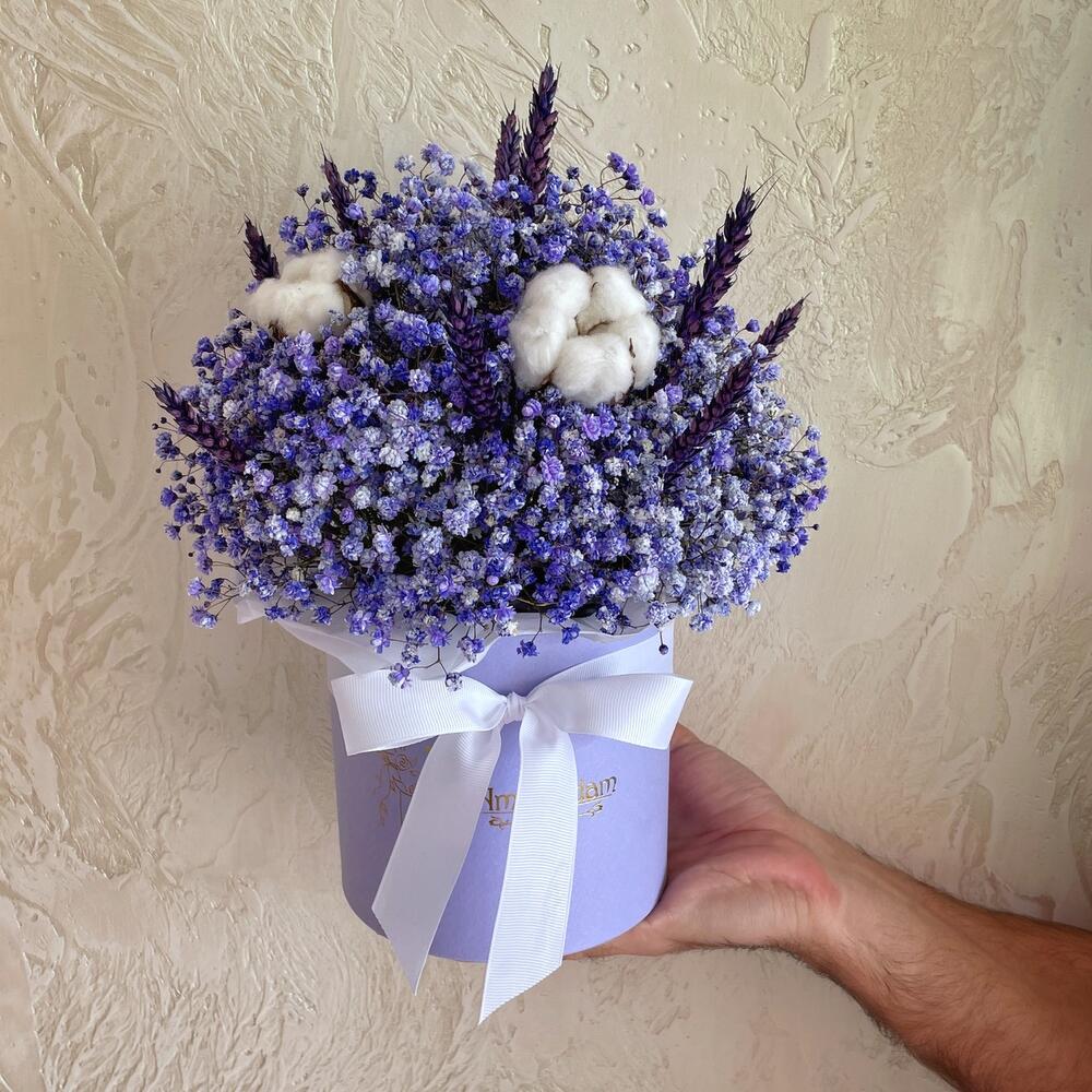 Букетик в шляпной коробочке, который будет долго радовать получательницу своей красотой. Отличный подарок на День рожденья, без повода, для украшения дома или офиса.