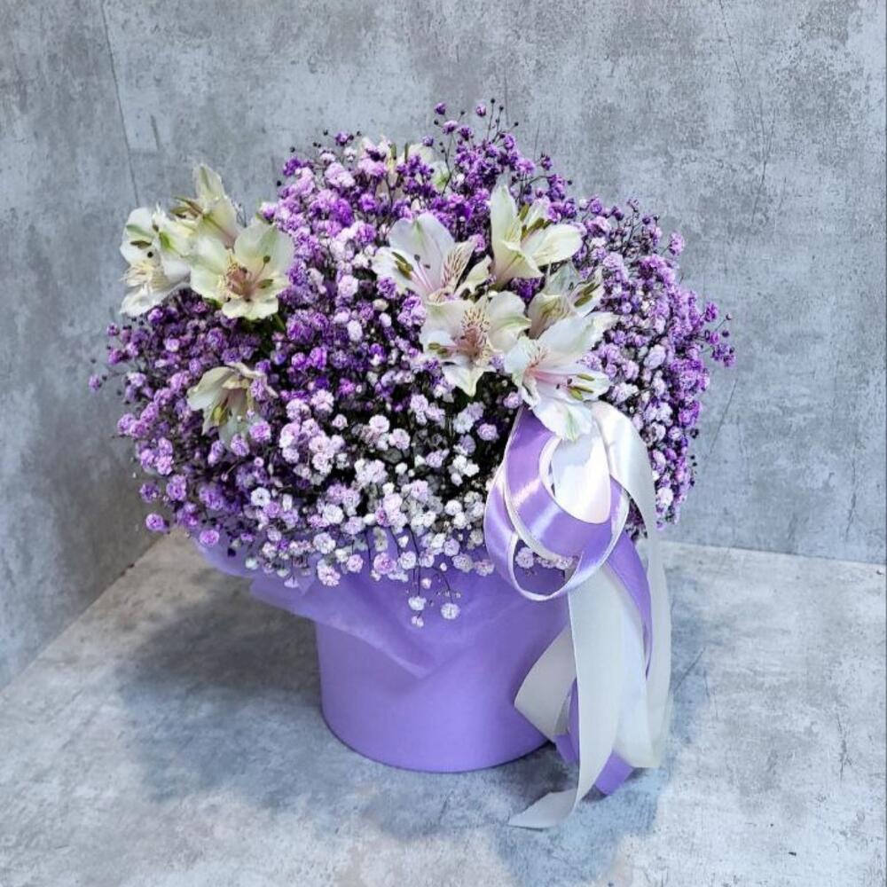 Гипсофила – 5 шт.Альстромерия – 3 шт.Лента атласная – 2 шт.Шляпная коробка – 1 шт.Оазис флористический – 1 шт.