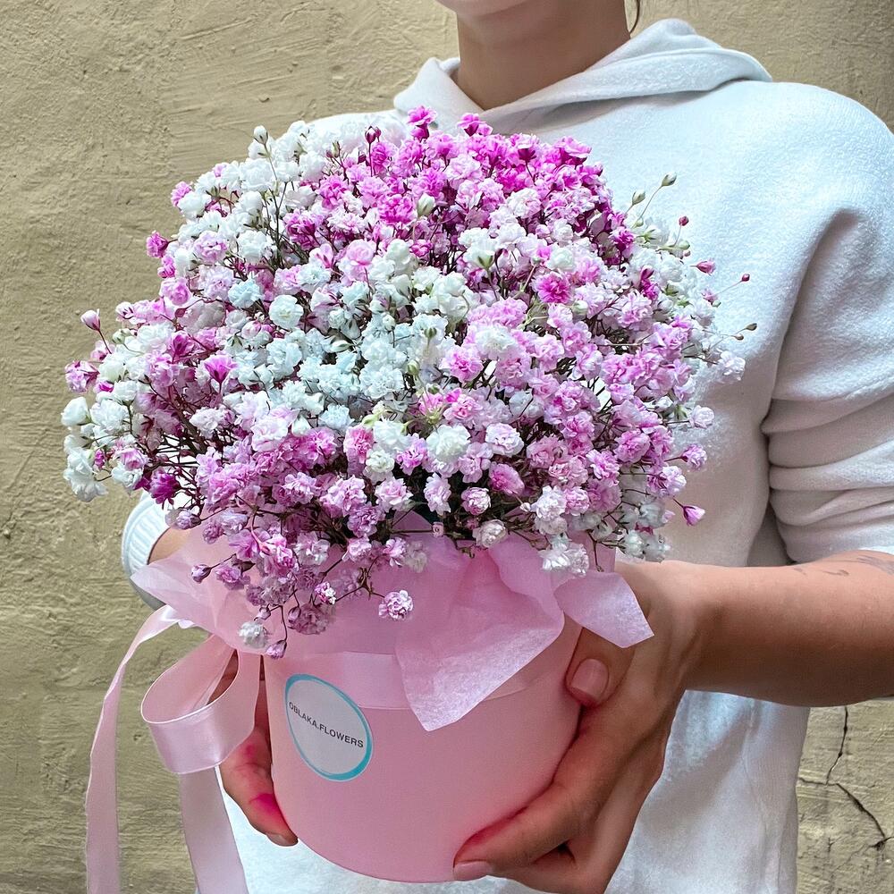 Гипсофила – 5 шт.Коробка шляпная – 1 шт.Лента атласная – 1 шт.Губка флористическая – 1 шт.