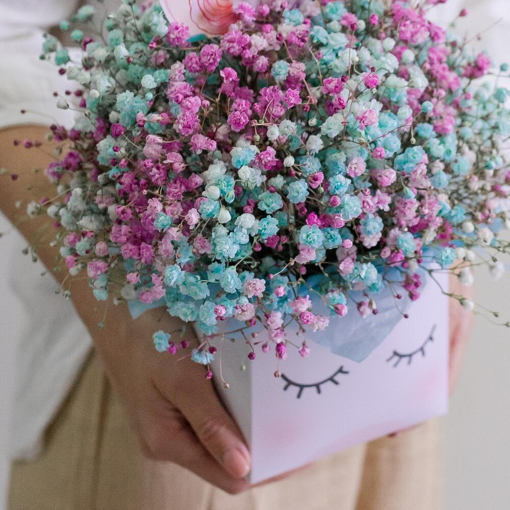 Гипсофила – 5 шт.коробка единорог – 1 шт.Оазис флористический – 1 шт.Тишью – 4 шт.