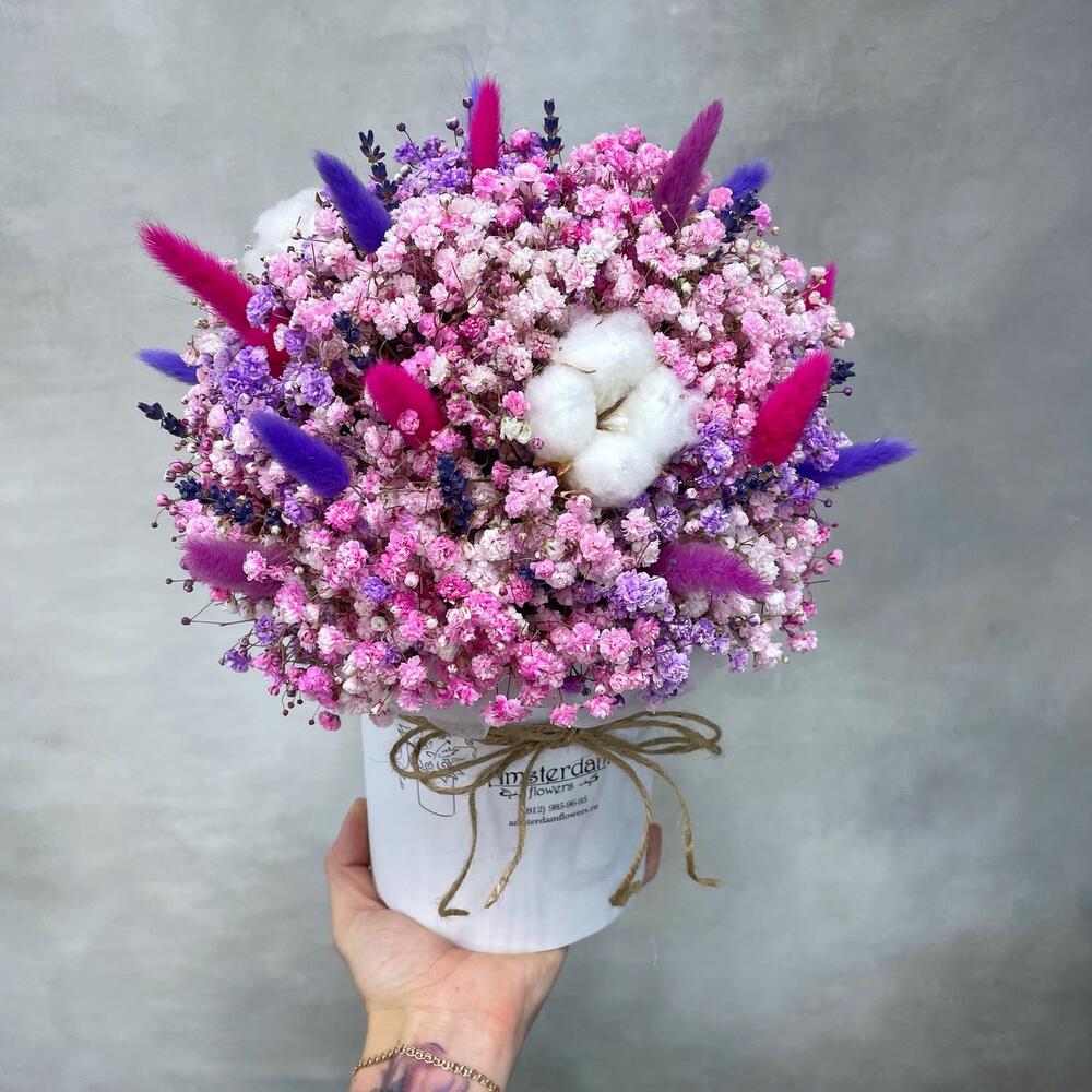 Хлопок – 3 шт. Коробка шляпная – 1 шт. Лагурус – 10 шт. Оазис флористический – 1 шт. гипсофила цветная – 7 шт.