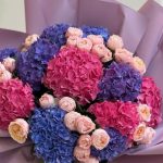 Букет из гортензии и розовых пионовидных роз