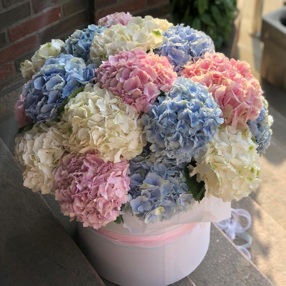 Тишью – 4 шт.Коробка шляпная – 1 шт.Флористическая губка (оазис) – 5 шт.лента премиум – 4 шт.гортензия голландия микс – 21 шт.