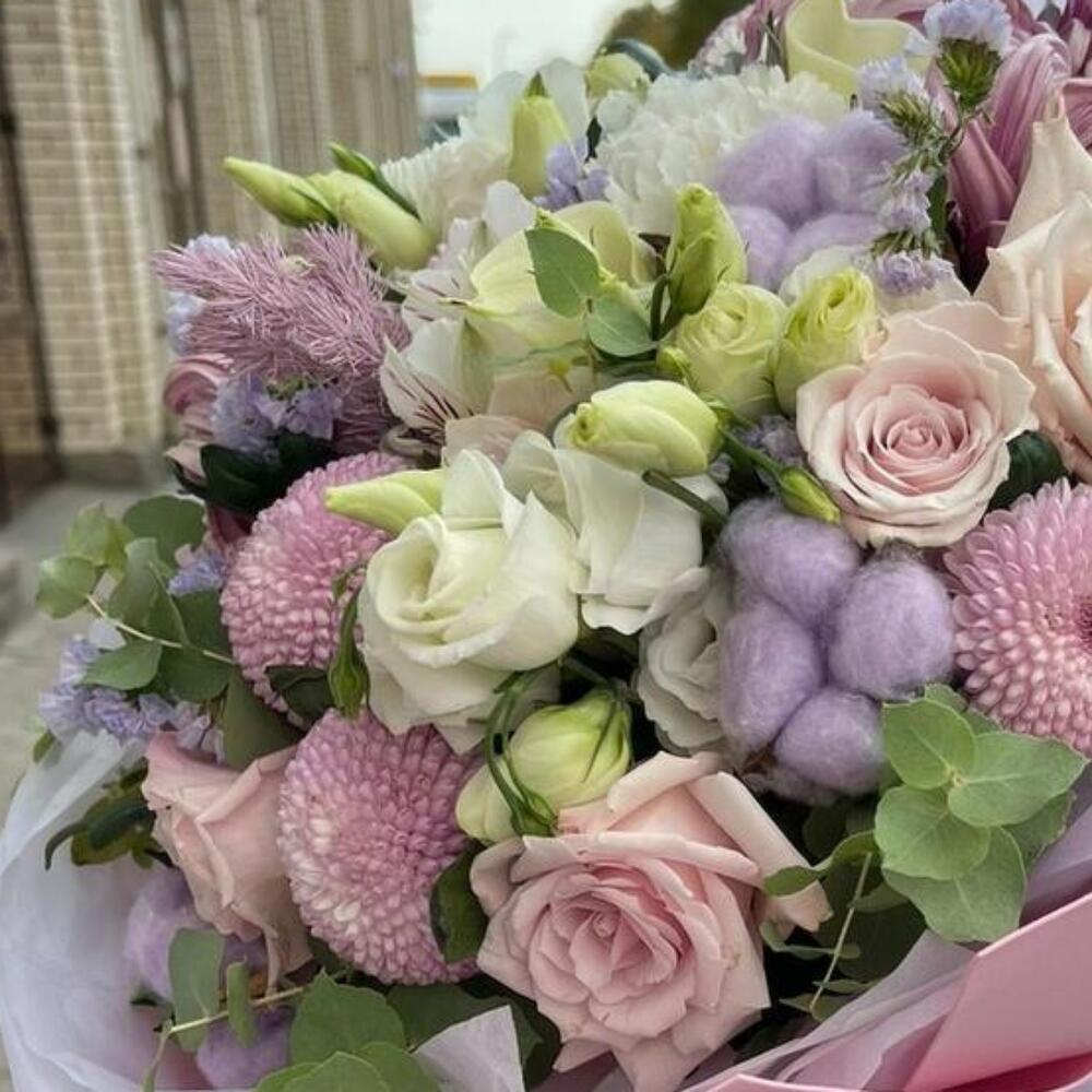 «Лавандовое созвездие» Букет из розы, гвоздики, статица и хлопка