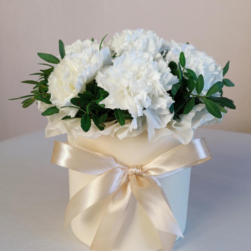 Гвоздика – 7 шт.Лента атласная – 2 шт.Тишью – 1 шт.Коробка шляпная – 1 шт.Оазис флористический – 1 шт.зелень декоративная – 3 шт.