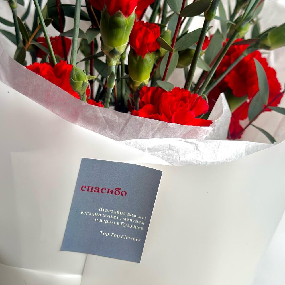 Эвкалипт – 2 шт.Гвоздика кустовая – 9 шт.Упаковка дизайнерская – 1 шт.Открытка – 1 шт.