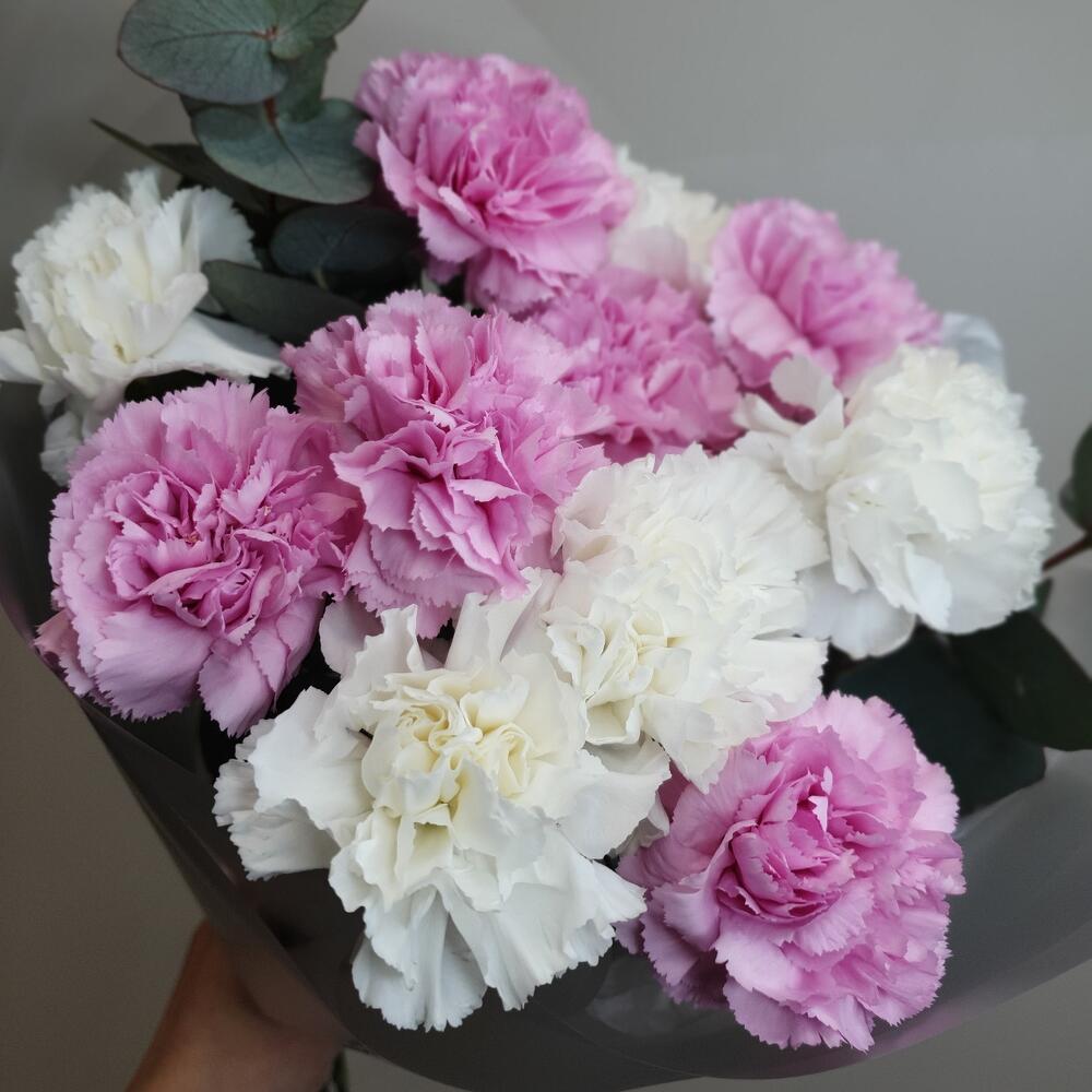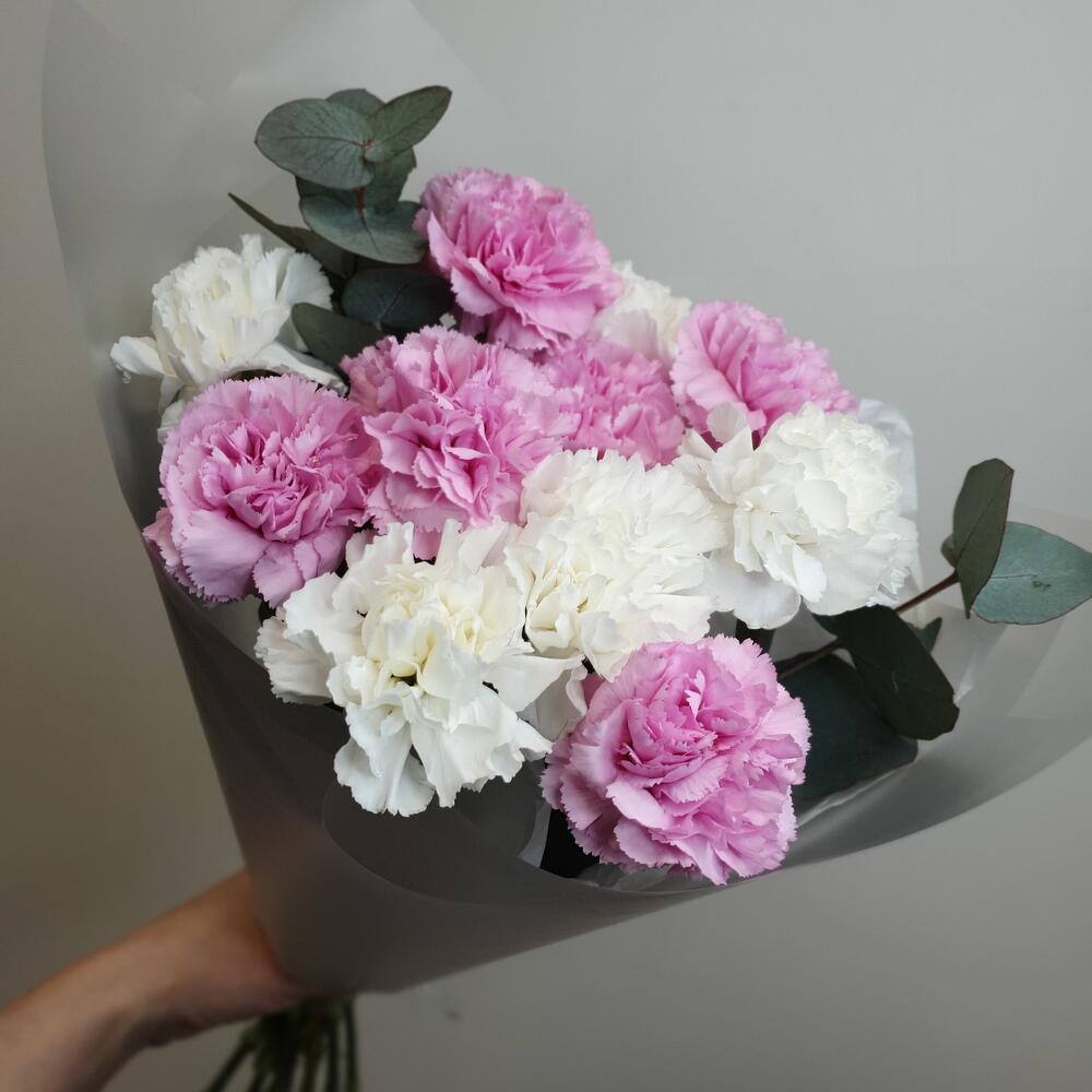 Диантус – 11 шт.Эвкалипт – 3 шт.Упаковка дизайнерская – 2 шт.