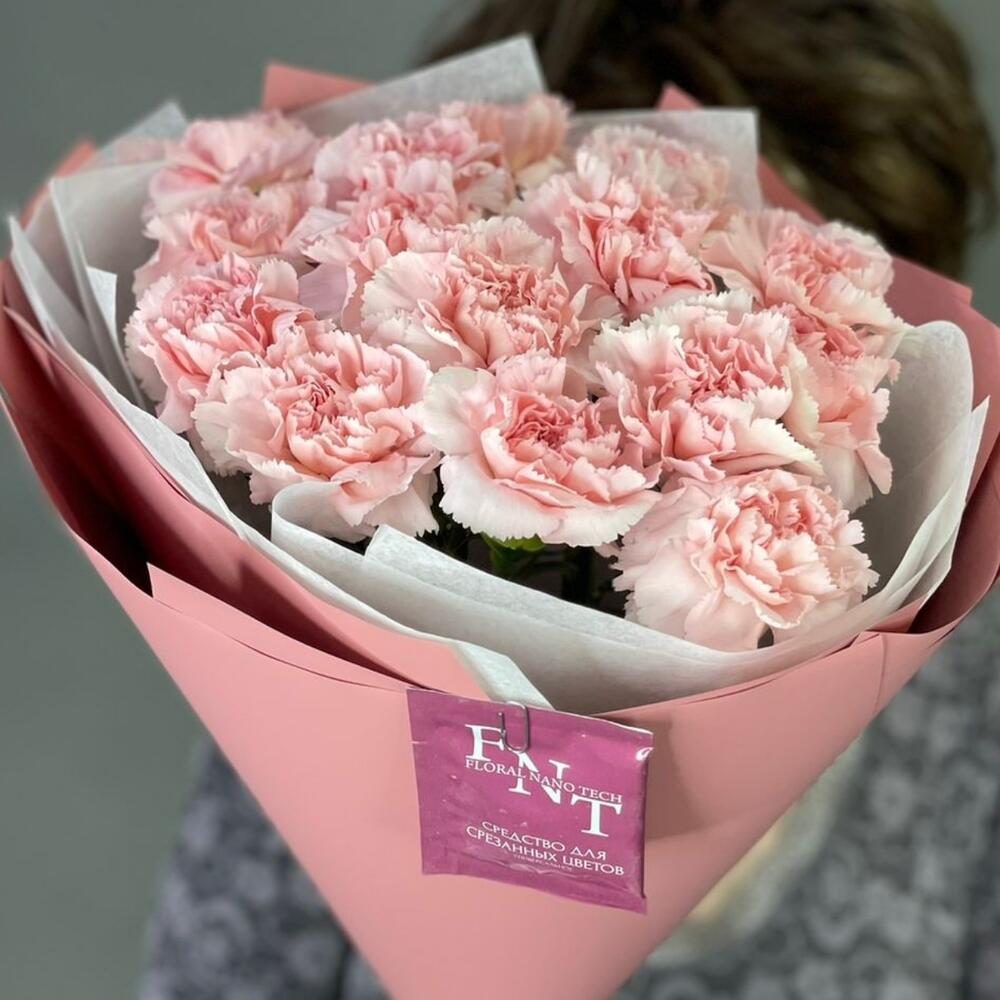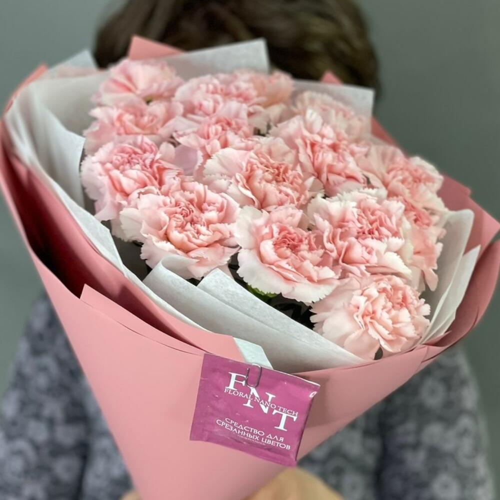 Гвоздика розовая – 15 шт.Бумага тишью – 4 шт.Пленка матовая – 5 шт.Лента атласная – 2 шт.