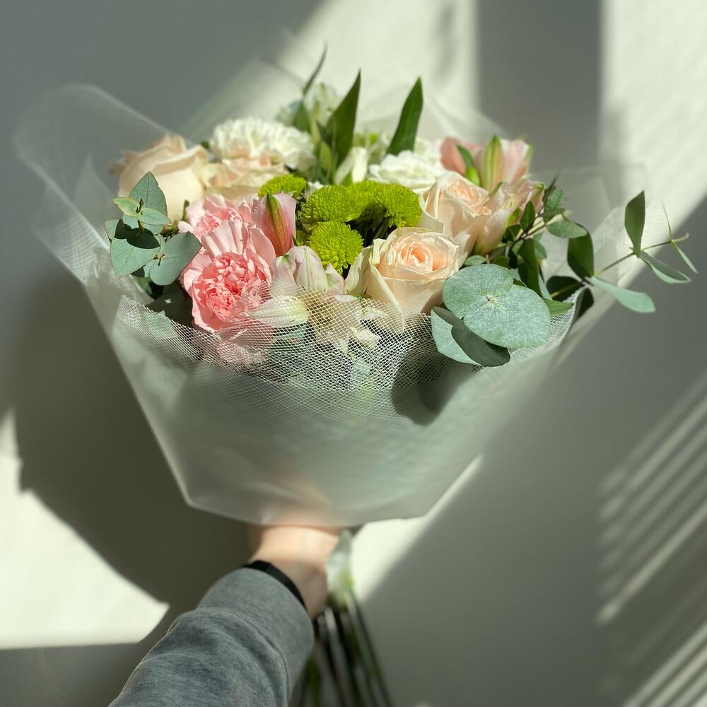 Альстромерия – 3 шт.Роза – 4 шт.Зелень – 5 шт.Упаковка – 7 шт.Гвоздика – 5 шт.Сантини – 1 шт.Фисташка – 6 шт.