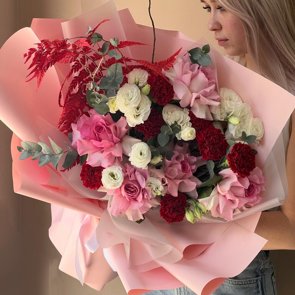 Гвоздики, Кустовые розы, Лизиантусы, Пионовидные розы, Розы