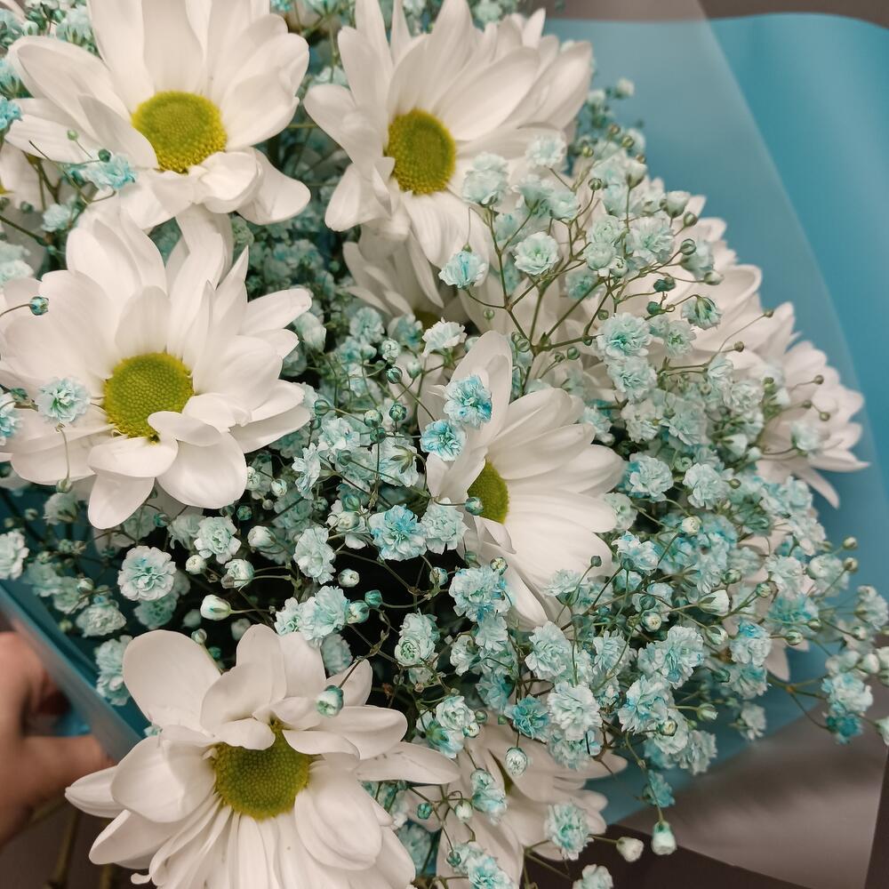 Гипсофила – 2 шт.Хризантема кустовая – 3 шт.Упаковка дизайнерская – 1 шт.