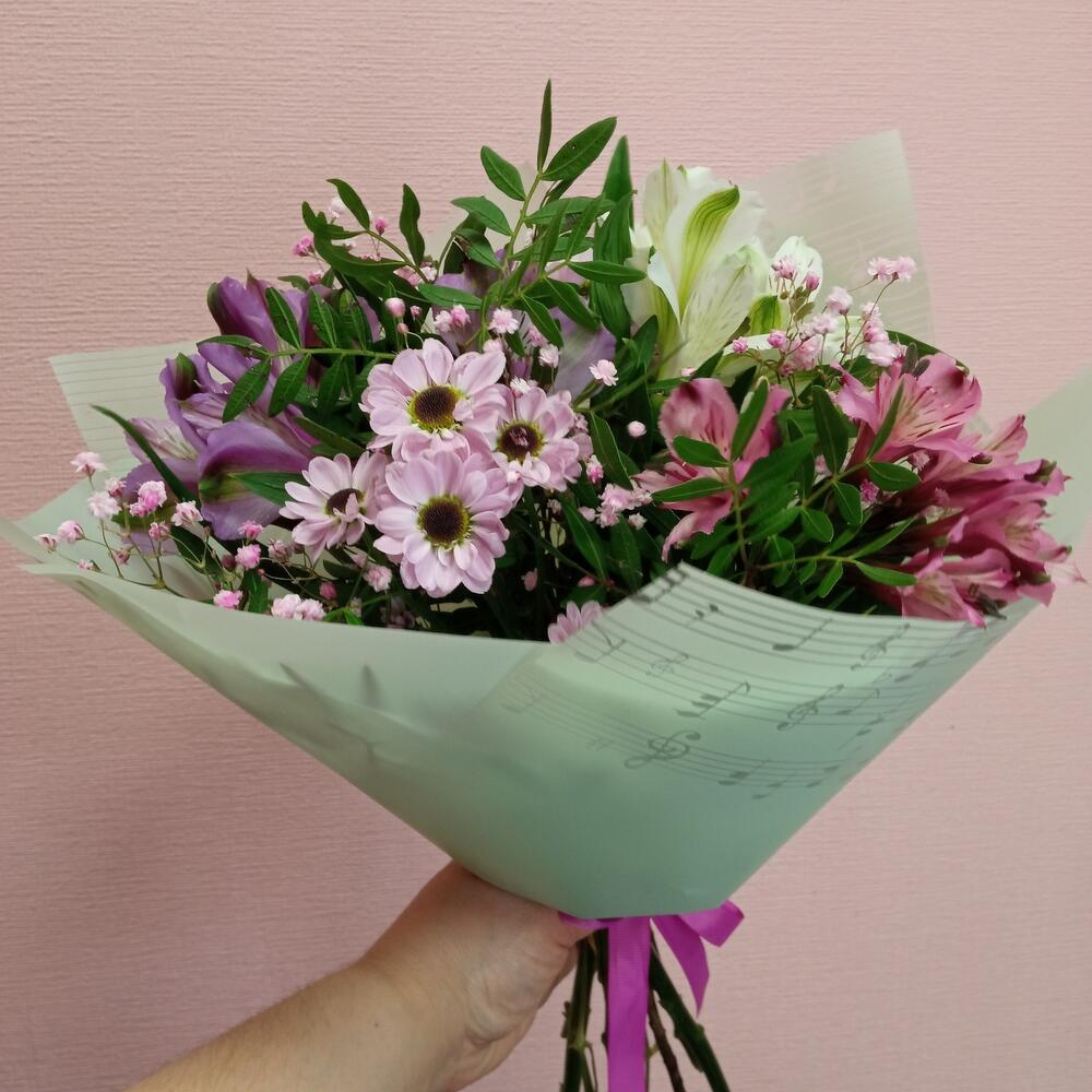 Альстромерия – 3 шт.Хризантема Сантини – 4 шт.Упаковка – 1 шт.Лента атласная – 1 шт.зелень декоративная – 2 шт.гипсофила радужная – 1 шт.