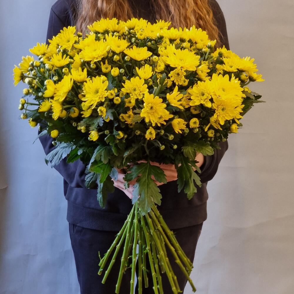 Желтая кустовая хризантема – 19 шт.Лента атласная – 1 шт.