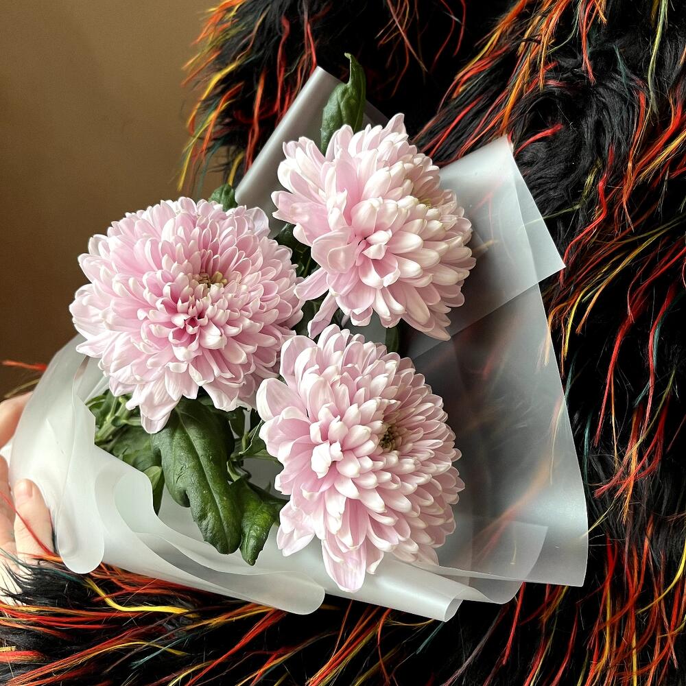В сиреневую даль: 3 стойких хризантем в стильной упаковке