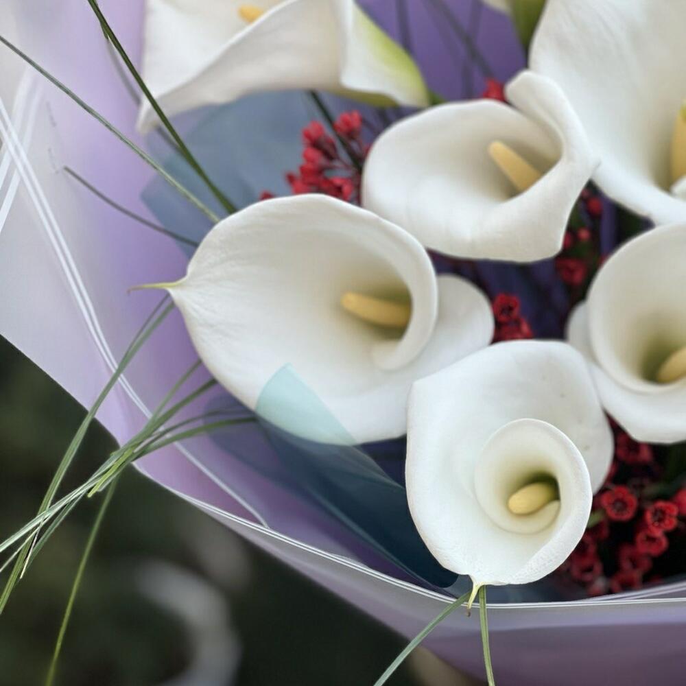Калла – 11 шт. Хамелациум – 3 шт. Берграсс – 1 шт. Упаковка дизайнерская – 8 шт. Лента – 1 шт.