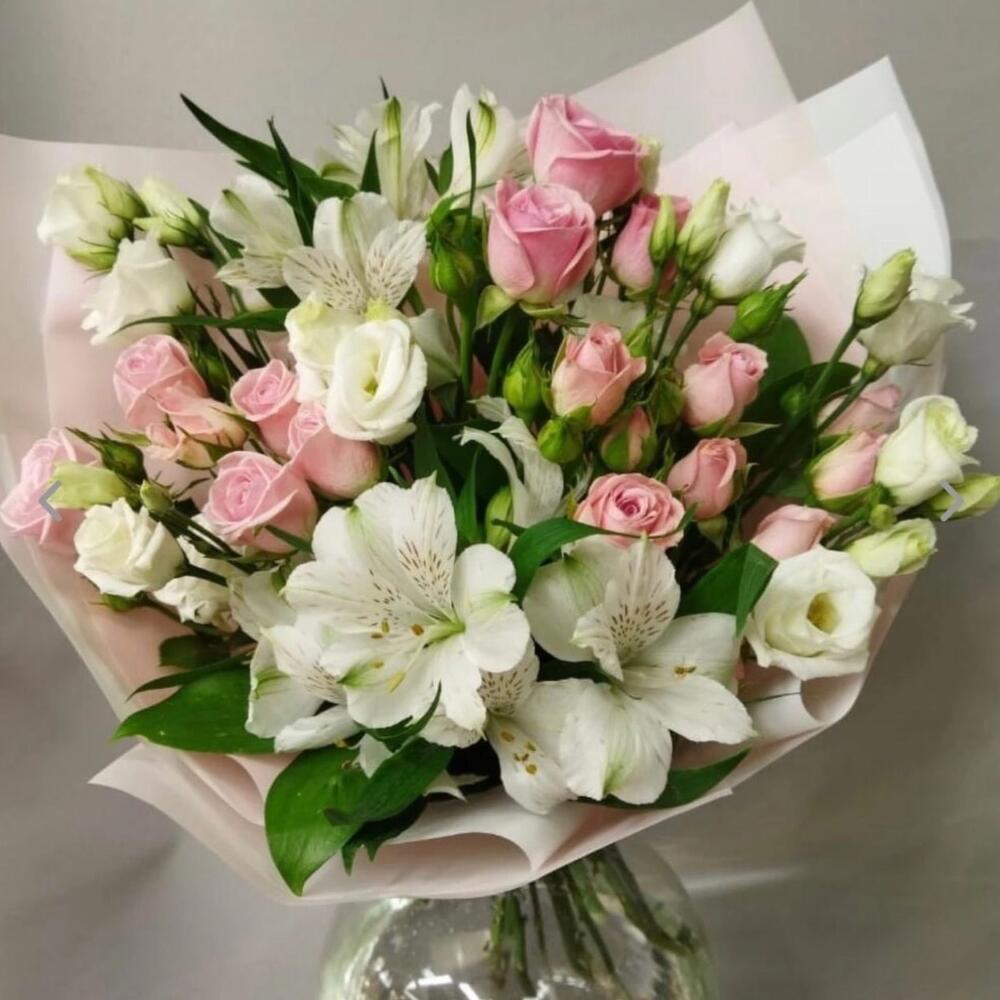 Роза кустовая – 4 шт.Лизиантус – 2 шт.Альстромерия – 2 шт.Рускус – 5 шт.