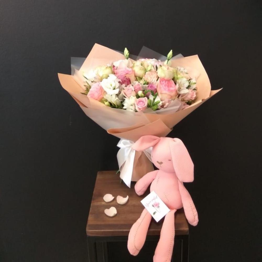 Альстромерия – 2 шт.Лизиантус – 2 шт.Фрезия – 5 шт.Кустовая роза – 5 шт.Атласная лента – 1 шт.Фисташка пучок – 2 шт.Роза одноголовая пионовидная – 2 шт.Карточка для подписи – 1 шт.Роза одноголовая эквадор 50 см – 2 шт.Пленка корейская – 2 шт.Прищепка – 1 шт.роза кения – 5 шт.