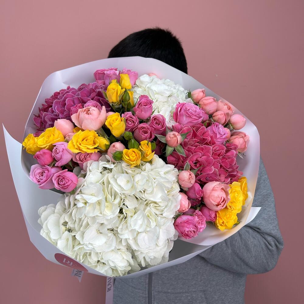 Шикарный букет из гортензий и кустовых роз