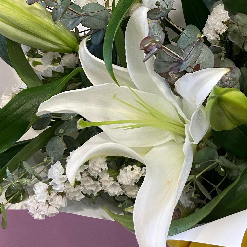 Лилия белая – 3 шт.Статица – 2 шт.Эвкалипт – 3 шт.Корейская упаковка – 1 шт.бант атласный – 1 шт.