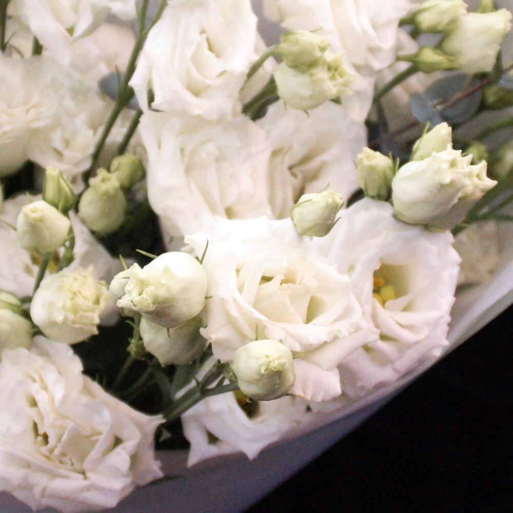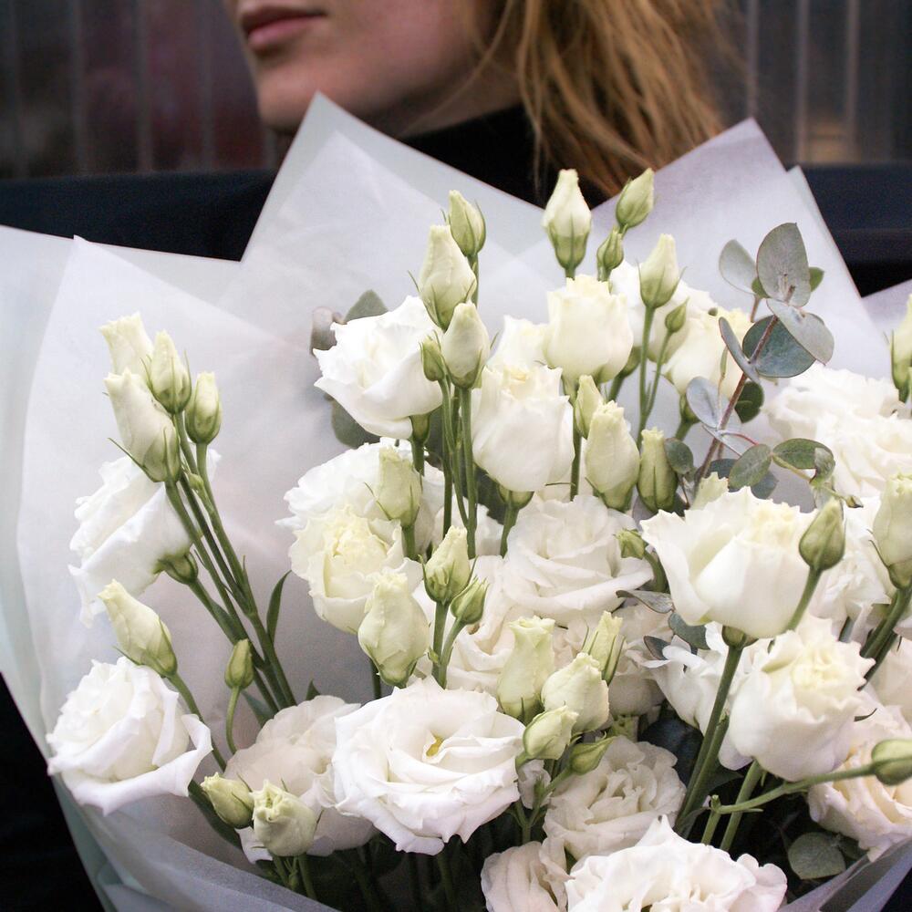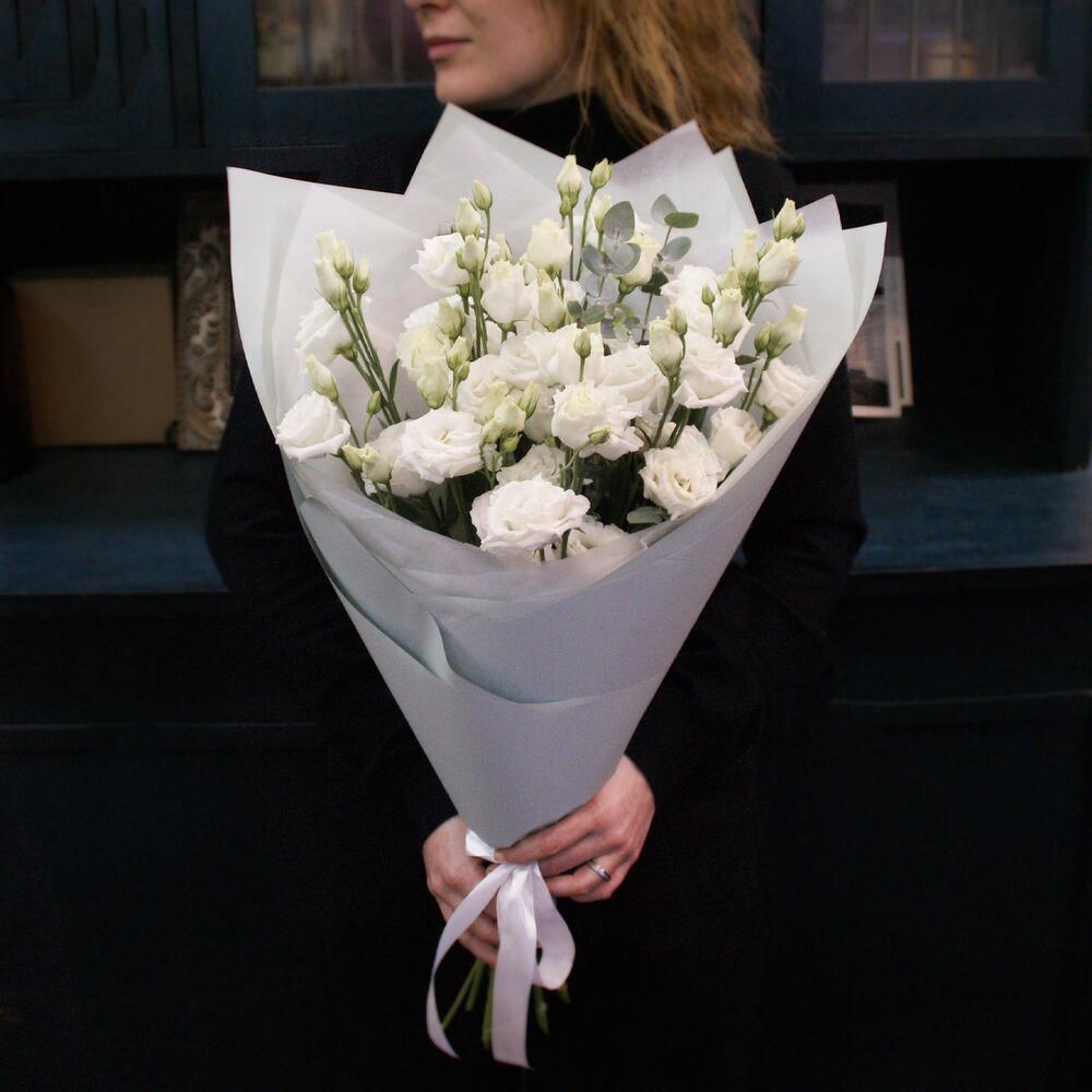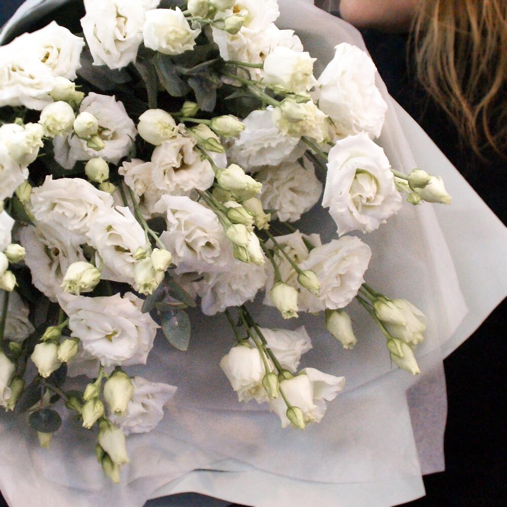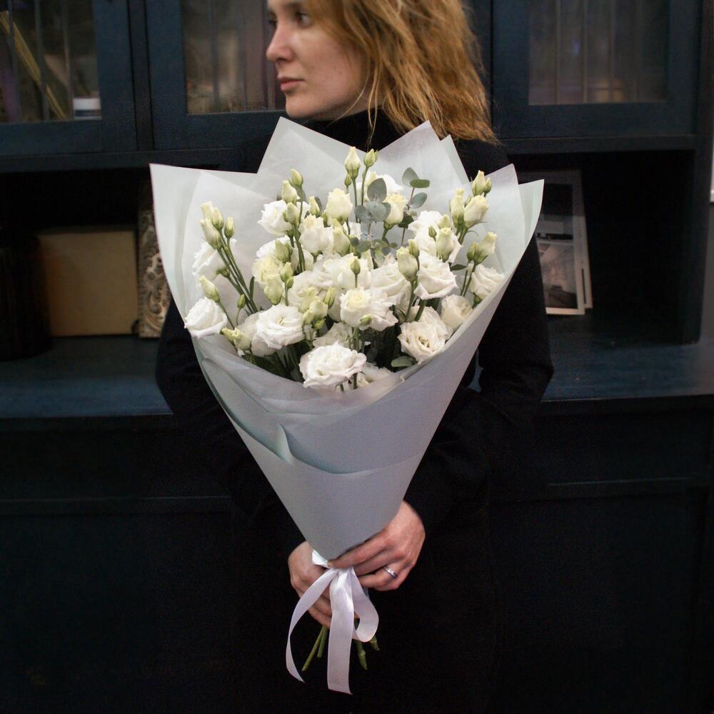 Эвкалипт – 2 шт.Эустома – 9 шт.Тишью – 2 шт.Атласная лента – 2 шт.Матовая пленка – 1 шт.