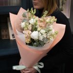 Лизиантус – 3 шт.Маттиола – 4 шт.Эвкалипт – 1 шт.Тишью – 1 шт.Атласная лента – 2 шт.Матовая пленка – 1 шт.