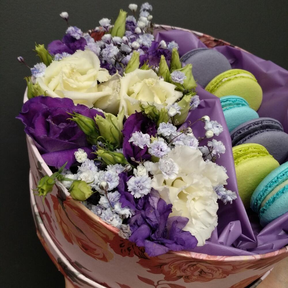 Сочное сочетание махровых лизиантусов с наивкуснейшими французскими пирожными.Цвет коробки может отличаться от фото