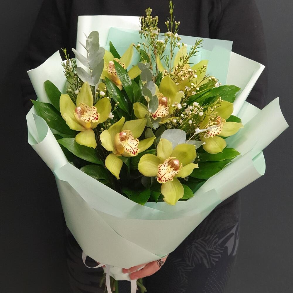 Орхидея Цимбидиум – 7 шт.Ваксфлауэр – 1 шт.Эвкалипт – 3 шт.Зелень – 10 шт.Упаковка дизайнерская – 1 шт.Лента атласная – 1 шт.