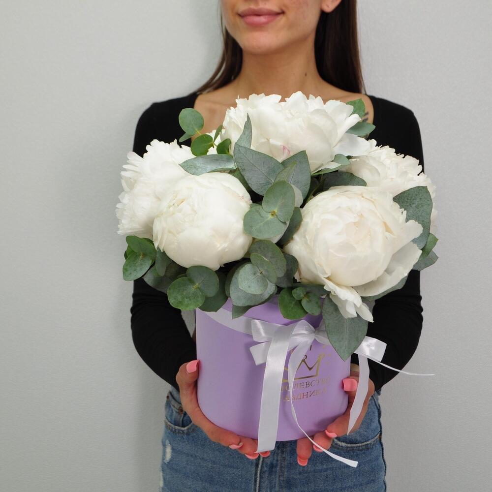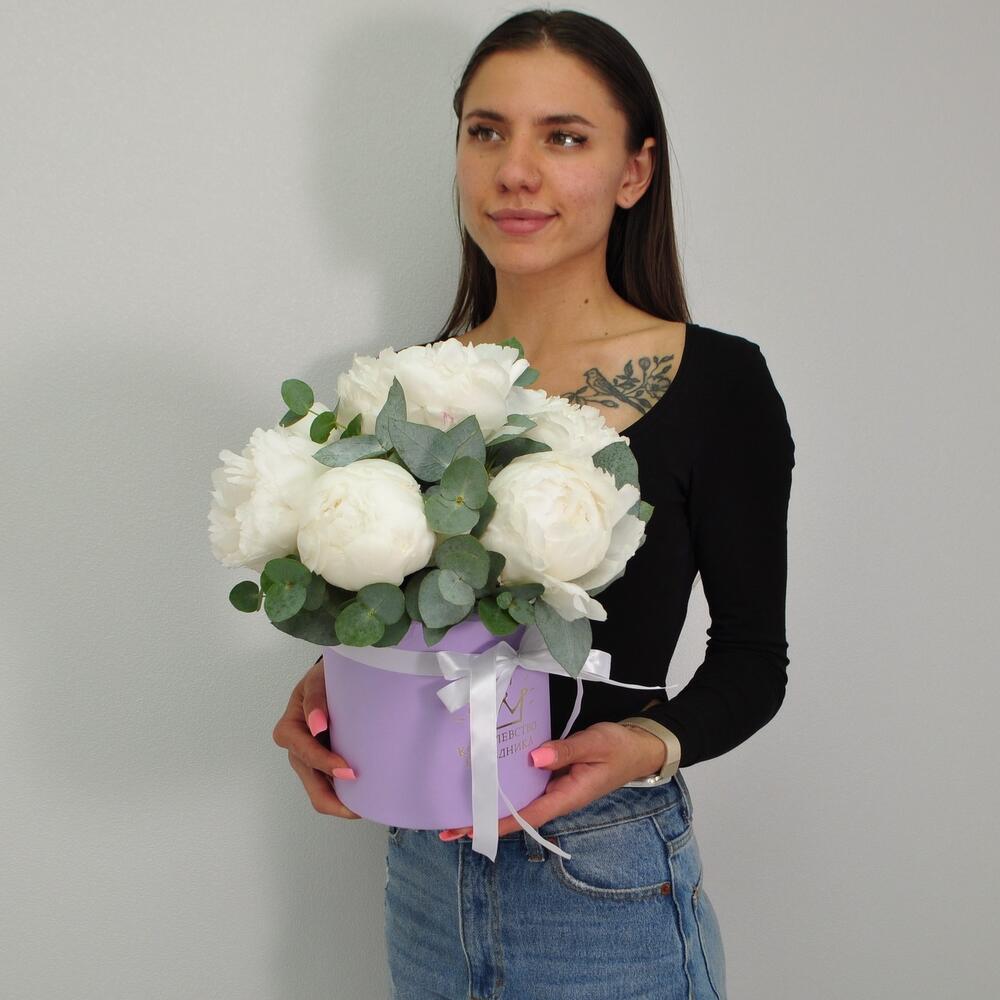 Эвкалипт – 1 шт.Лента атласная – 1 шт.Пион белый – 7 шт.Оазис флористический – 1 шт.Коробка шляпная – 1 шт.