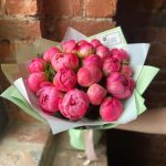 Букет из 21 кораллового пиона в дизайнерской упаковке “Коралл Саншайн”