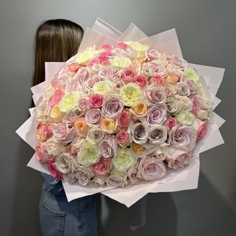 Альстромерии, Кустовые розы, Лизиантусы, Пионовидные розы, Розы, Ромашки