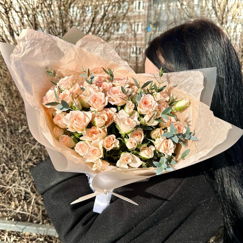Роза кустовая – 11 шт.Эвкалипт – 3 шт.Лента атласная – 1 шт.Пленка матовая – 2 шт.Открыточка с вашими пожеланиями – 1 шт.тишью персиковое – 2 шт.