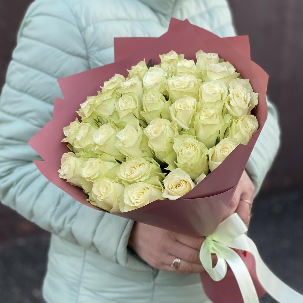 Букет из 31 белой розы Аваланч – это беспроигрышный вариант, такой букет не оставит равнодушной ни одну девушку.