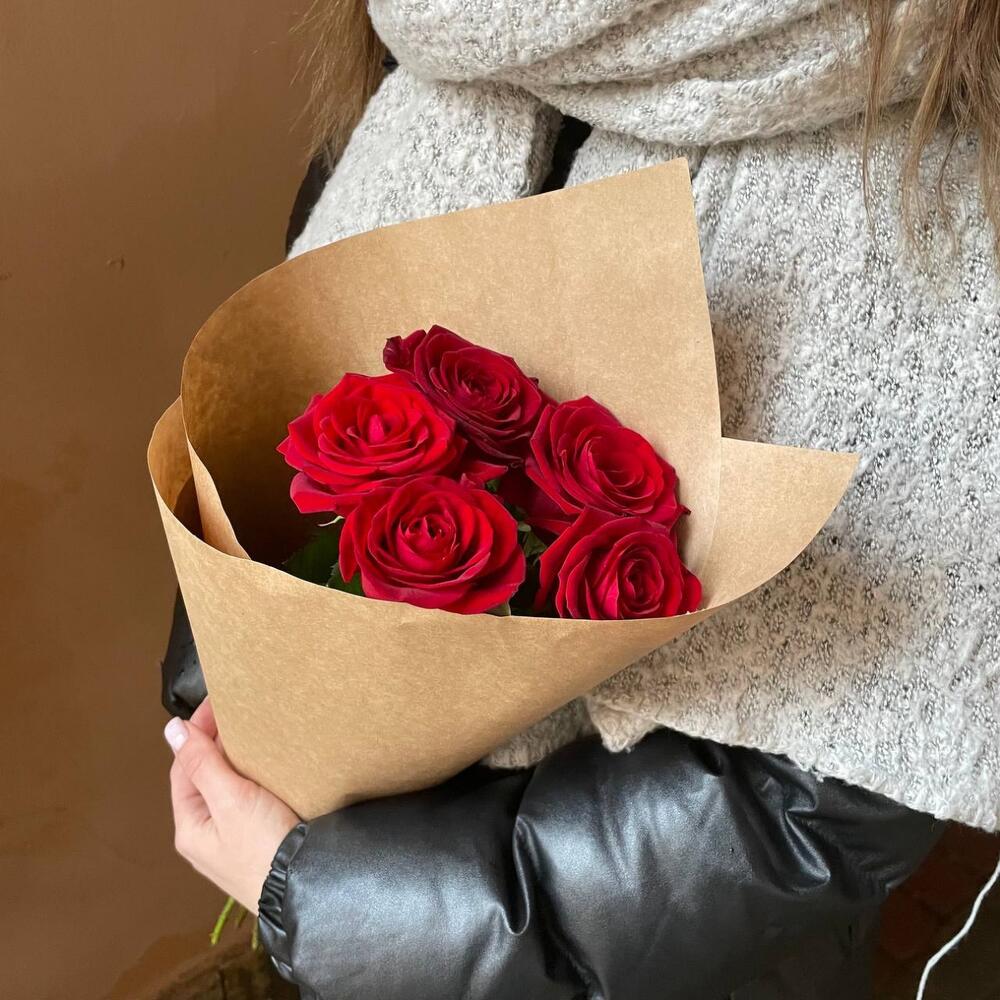 Роза красная россия – 5 шт.Крафт дизайнерский – 1 шт.