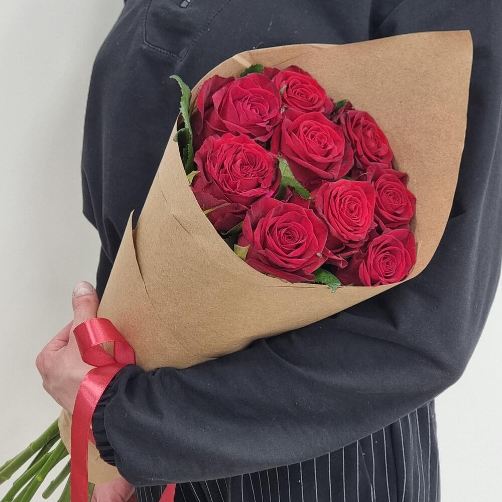 Лента атласная – 1 шт.Роза красная 60 см – 9 шт.Крафт упаковка – 1 шт.