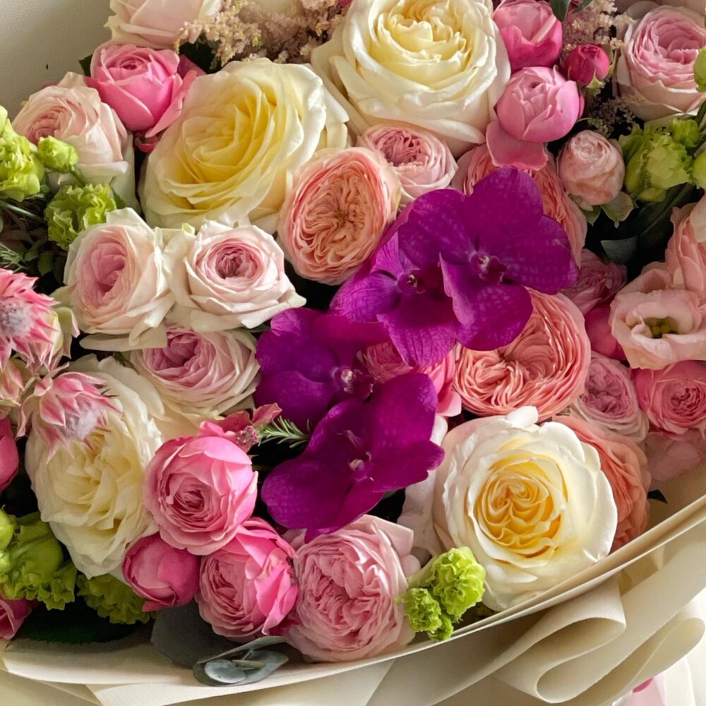 Гвоздики, Кустовые розы, Лизиантусы, Пионовидные розы, Розы
