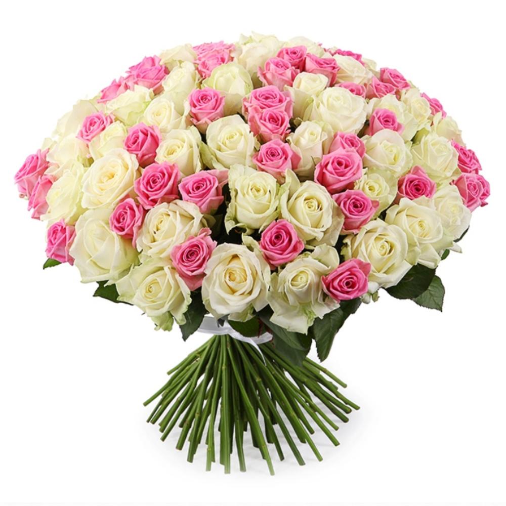 Атласная лента – 1 шт.Роза белая 50 см – 51 шт.Роза розовая 50 см – 50 шт.