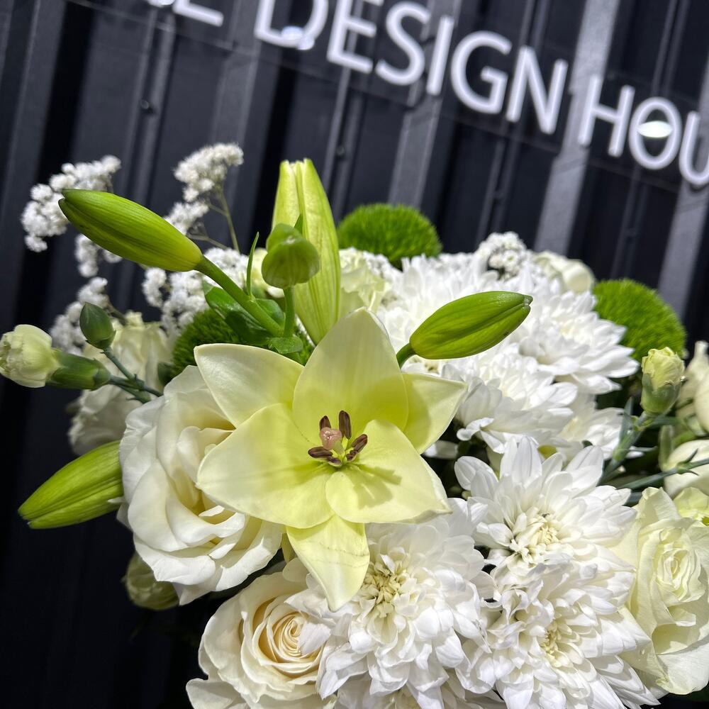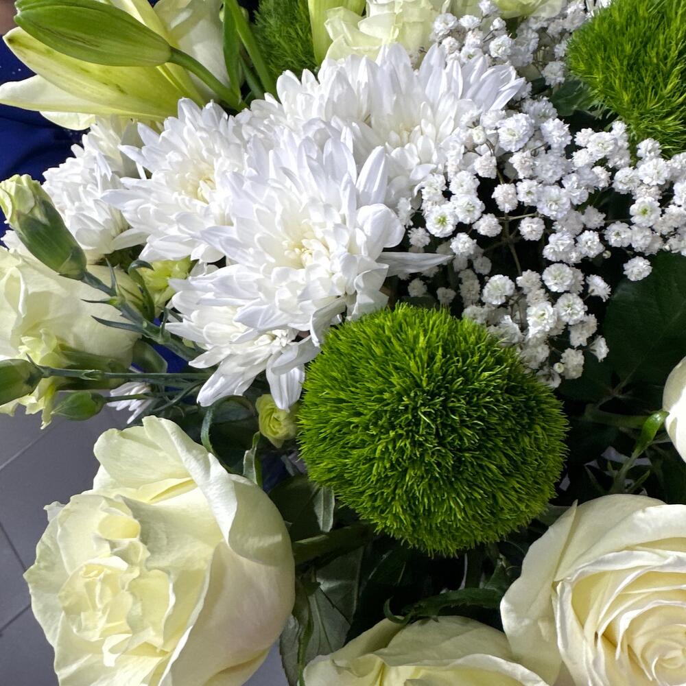 Белый авторский букет словно изящный танец света и чистоты. Изысканно переплетаясь, белые розы, каллы и лилии создают образ нежной элегантности, наполняя воздух сладким ароматом и сиянием свежести. Этот букет словно поэзия из белоснежных красок, в которой каждый цветок является чистым выражением вечной красоты.