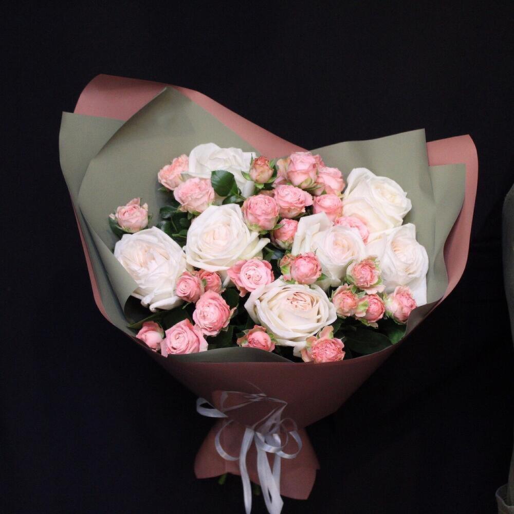 роза пионовидная white o’hara – 7 шт.Роза кустовая пионовидная мадам бомбастик – 5 шт.Пленка дизайнерская – 5 шт.Лента атласная – 1 шт.