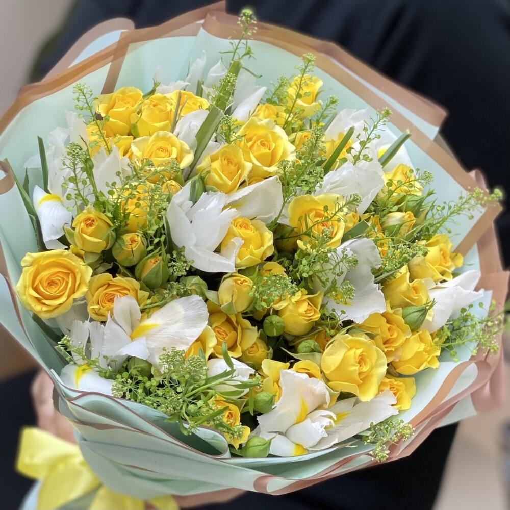 Альстромерии, Гвоздики, Кустовые розы, Лизиантусы, Розы, Хризантемы